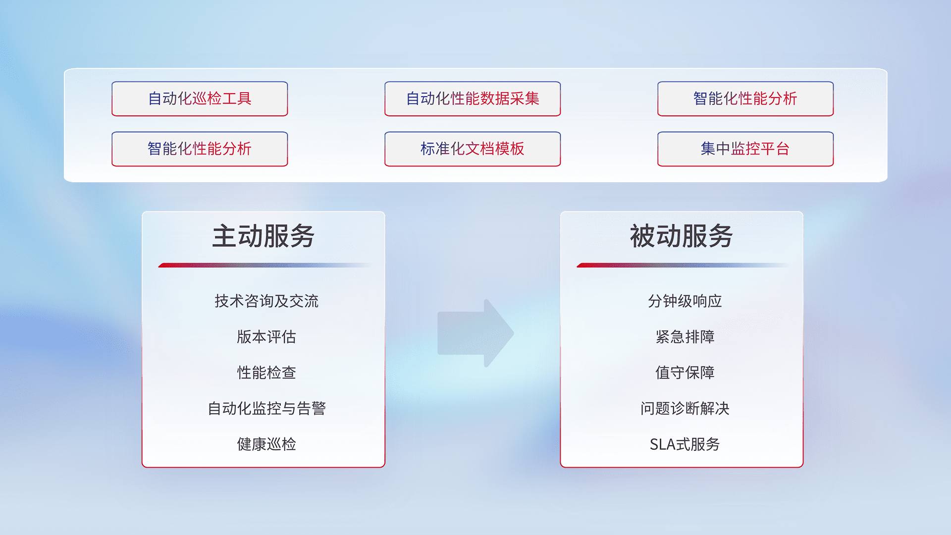 智能化工具和标准化文档,,保障服务质量,,提供主动服务(包含技术咨询、、、版本评估、、、性能检查、、、、自动化监控与告警、、、健康巡检)和被动服务包含(分钟级响应、、紧急排障、、值守保障、、问题诊断解决、、、SLA服务)。。。